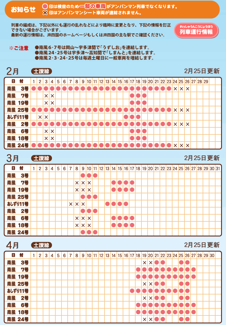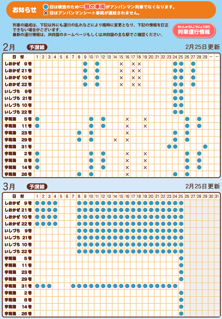 ◯ = 車輛檢查維修, 班次不是麵包超人列車, 只是普通列車