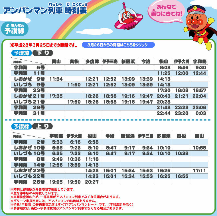 點擊各路線圖的連結, 便可以看到有關麵包超人列車的時刻表。