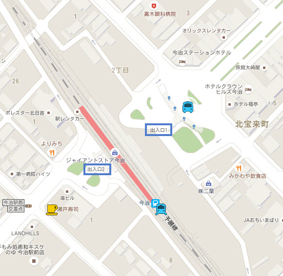 馬上跑往火車站出入口1, 很幸運地竟然「盲中中」走到一輛巴士的前面, 也不知當天為何那麼走運。抬頭望望, 車頭上掛上往「今治營業所」, 心想應該是這巴士了。氣喘喘的隨口問問車長是否往「Imabari Castle」? 看見車長正磨拳擦掌準備開車, 沒有理會我們的問題。看見這情形, 便立即將腳踏入車門內, 上車才算吧! 還清楚記得前年在熊本城乘免費接駁巴士往城彩苑的情況, 司機半秒也不會等的!
