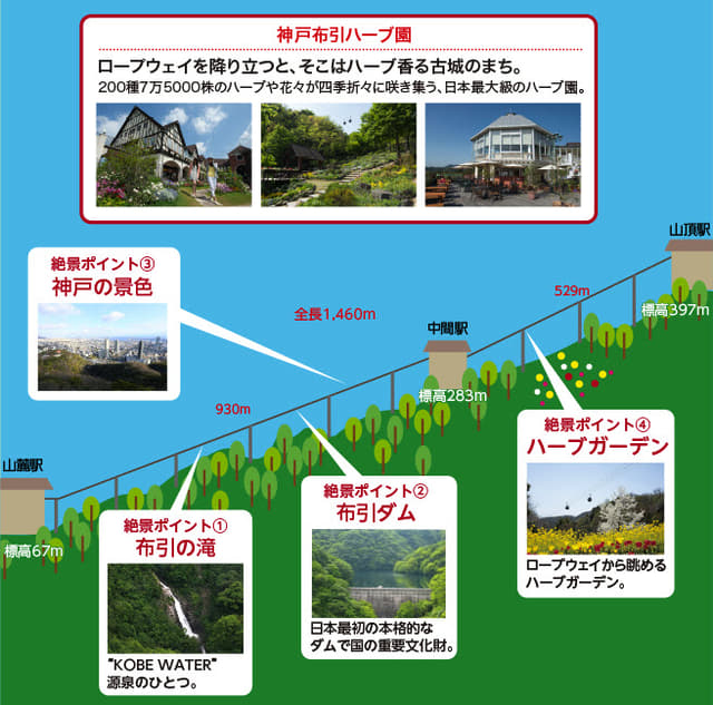 到達布引香草公園山頂的山麓駅, 纜車全長 1,460 公尺, 全程約十三分鐘。