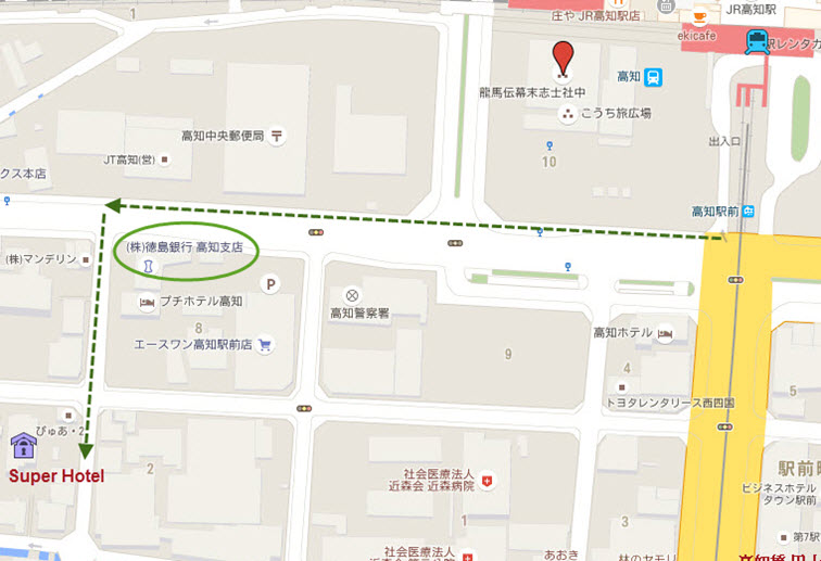 在火車站廣場走過馬路, 轉右走幾分鐘, 在德島銀行的街口轉左沿漆黑狹窄的小巷走一會, Super Hotel 便在右邊的小巷中閃出。