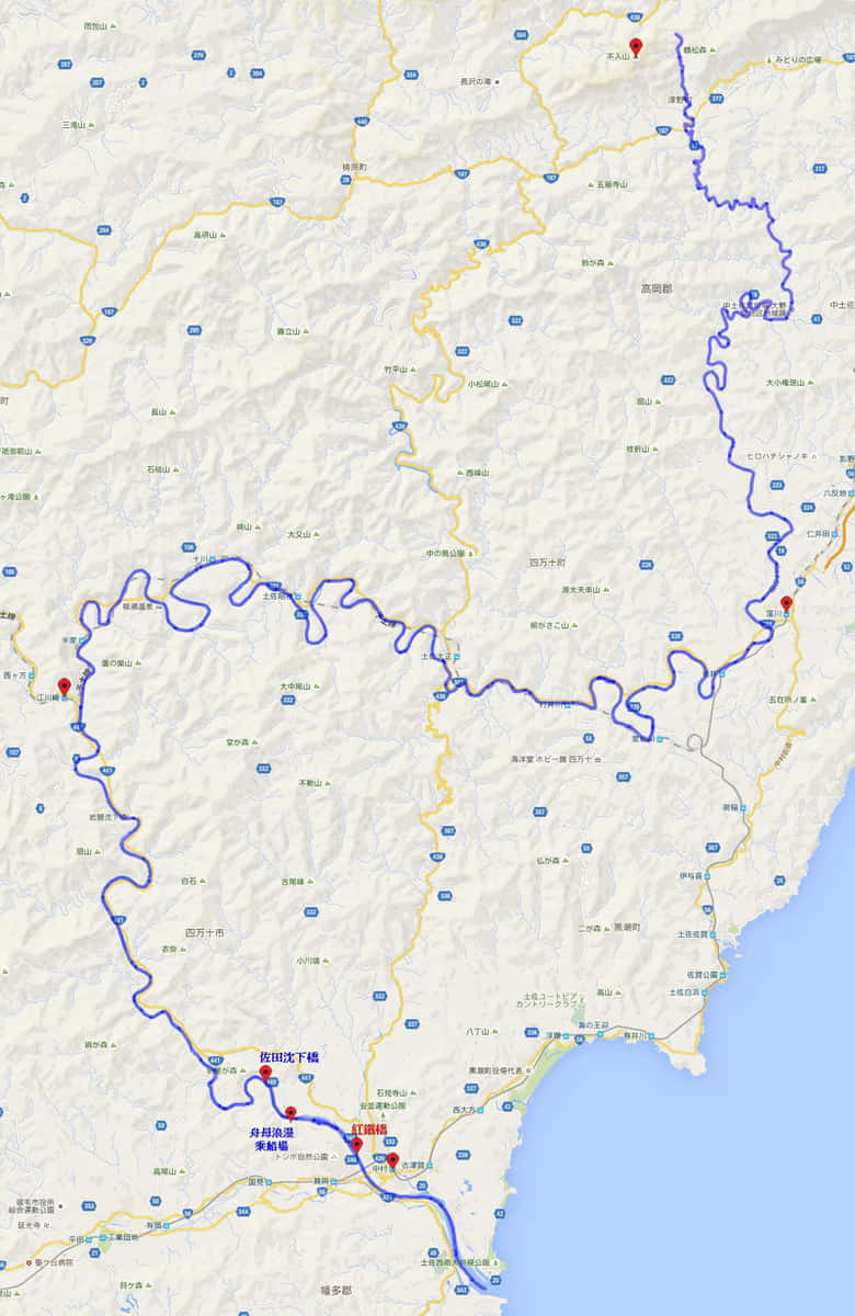 四万十川是日本四國第二大河, 發源於四國西面高知縣高岡郡津野町的「不入山」, 而不入山「不入溪谷」最上面的流域就是四萬十川的起點。四万十川流經高知縣, 在中村市下田流入土佐灣, 全長 196 公里。四万十川與杮田川和長良川並稱日本三大清流。四万十川整條河流都沒有建設水庫, 水質清澈見底, 約有150種魚類棲息於此, 堪稱日本第一, 有「日本最後一條清流」之稱, 也是日本名水百選、秘境百選之一。