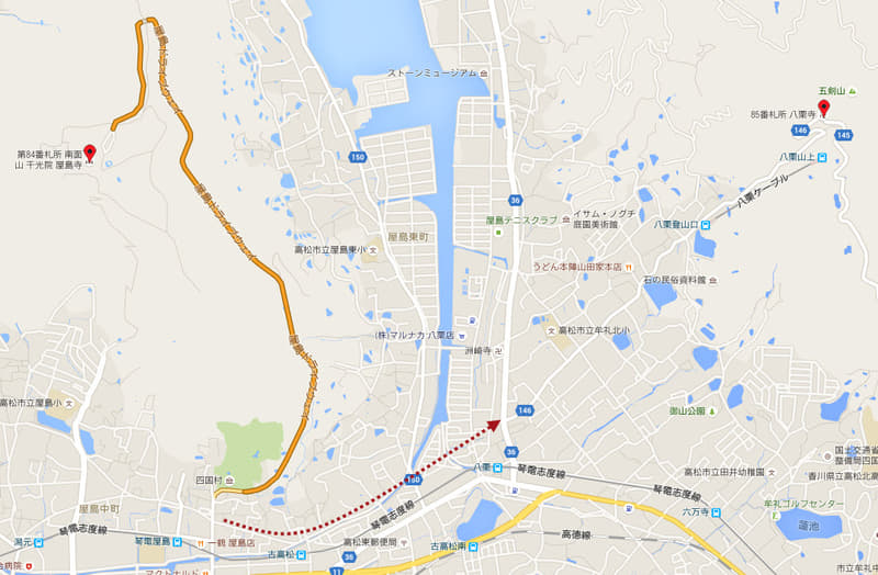 沿琴電屋島駅前的馬路往上走一會, 在第一個十字路口轉右, 沿一條較為狹窄的馬路走。