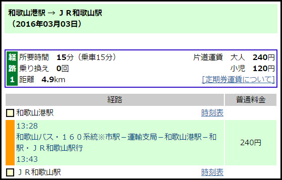 從和歌山港 乘 南海和歌山港線(和歌山市行)到歌山市(150円), 再轉乘 紀勢本線支線(和歌山行)到 和歌山駅(190円)。全程車資共340円。