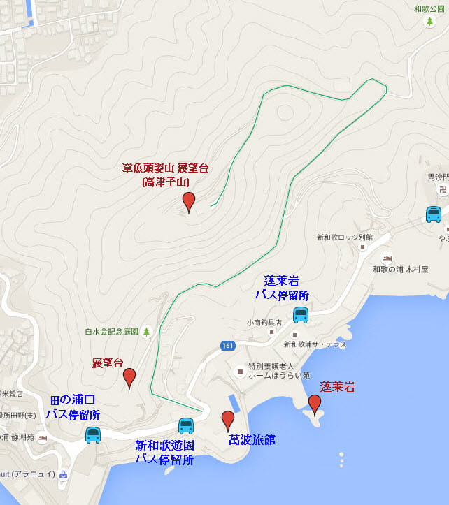 下了巴士, 接著的行程是登上章魚頭姿山 (高津子山) 展望台眺望和歌浦灣及欣賞櫻花。在網上完全找不到往高津子山展望台的資料, 但根據 Google Map 所示, 萬波旅館旁好像有一條小徑通往山頂的, 我們就單靠這線索, 帶著患得患失、只管一試的心情前往。