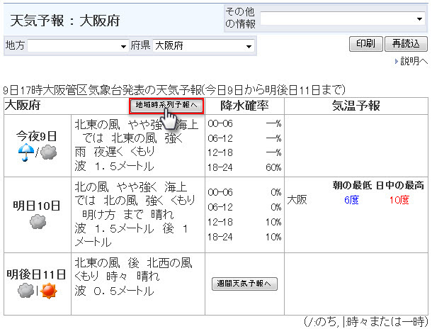 3. 如果嫌六小時的預測不夠頻密, 日本氣象廳網站還有一個最利害的功能, 就是可以預測每三小時的天氣變化。按下「地域時系列予報へ」按鈕, 如下圖所示: